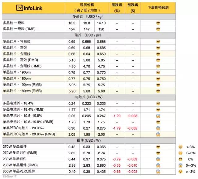 由于美国201并没有释出更多消息,本周组件没有出现太大变动,海内外一线大厂普遍能满单到十二月底,但随着印度双反最近仍处于调查阶段,对于明年一季度的需求目前仍抱持观望态势。但可以预见的是,十二月底开始,各项产品价格可能将随着欧美需求熄火、印度双反悬而未决而进一步走跌。