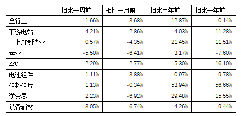 中上游制造业指数为电池组件指数、硅料硅片指数、逆变器指数、设备辅料指数的加权平均,反映了光伏中上游制造业企业的景气程度。下游电站指数为EPC指数和运营指数的加权平均,反映了电站EPC和运营行业整体的景气程度。而全行业指数由中上游制造业指数和下游电站指数加权平均得出,反映了市场对于光伏行业整体未来发展的预期,表明了光伏行业整体的景气程度。