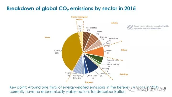 根据国际可再生能源署的数据,2015年全球碳排放中38%来自电力部门;22%来自交通(9%客用小汽车,8%公路运输,3%其他货运,2%其他客运);19%来自工业部门(水泥7%、钢铁6%、化工5%、铝业1%);9%来自建筑(5%房屋供暖、2%热水、2%做饭),3%来自区域供热供冷,8%来自其他。这些碳排放的部门中,货运、钢铁、水泥、化工的碳排放属于“刚性”,尚无经济可行的减排技术,占总排放的26%。
