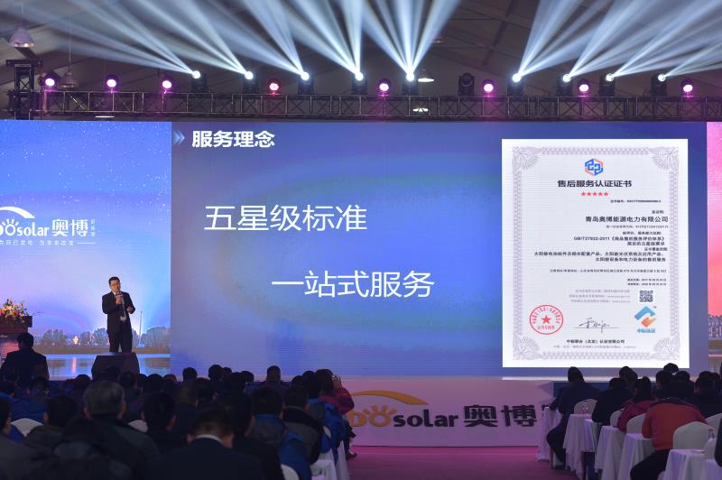 据记者现场了解,与业内其他龙头企业一样,在强势渠道的支持下,奥博自2015年起,就在行业中提出“家庭光伏”概念,坚持以直营经销为主的运营模式,在全国铺开户用光伏系统推广。在系统构建中,张建军副总经理公开表示,接受行业和媒体两方面的监督,坚持自产单晶组件+SMA逆变器+自产适配支架的强势组合,配合完善的售后和运维服务,在品质和服务的两端给予户用市场以强力推动。据张建军介绍,2018年是奥博发展的品牌年,面对市场的火爆和空前激烈的竞争,奥博将持续创新商业模式,用户引爆模式、合伙人计划、光伏贷推进、工商业项目、扶贫项目、金屋顶项目……等多种手段,继续推进户用光伏在市场上的拓展。同时,遵照 “五星级标准、一站式服务”的理念,奥博将为用户提供全生命周期的售后运维服务,阳光巡检、上门服务、备件维修、质保承诺等一系列为用户着想的实际行动未来将一一付诸实施。