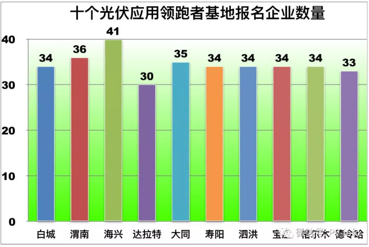 根据统计,每个领跑者基地单个项目的报名企业数量分别为30~41个。其中,报名企业数量最多的为河北海兴基地,共有41家企业报名;报名企业最少的为内蒙古达拉特基地,共有30家企业报名。