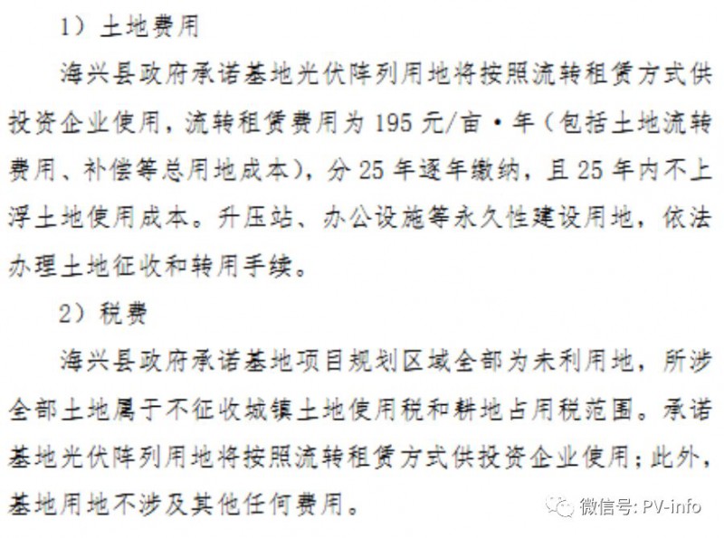 大同市政府承诺基地各类土地总用地成本低于200元/亩·年。其中,升压站和集电线路塔基采用征地方式供企业使用,征地费用按照国家政策规定交付;其余土地采用流转租赁方式供企业使用,土地租赁费分20年逐年缴纳,且20年内不上浮使用成本。