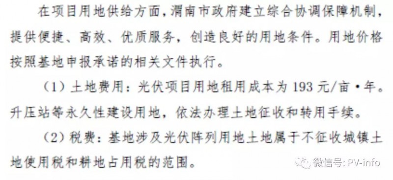 光伏阵列区土地采用流转方式供企业使用,0元/亩·年,20年内不上浮使用成本;升压站等永久设施用地以出让方式供企业使用,征地费用标准为15万元/亩。