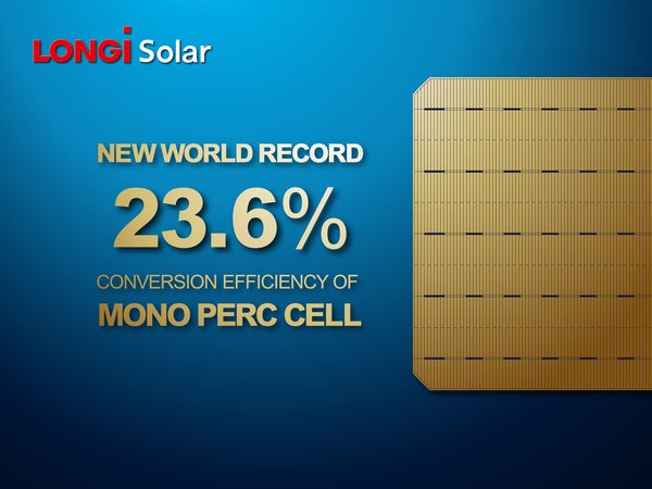 2018年2月28日,隆基乐叶在日本召开新闻发布会,正式对外宣布,经中国国家太阳能光伏产品质量监督检验中心(CPVT)测试认证,其单晶PERC电池转化效率最高已达到23.6%,再次成为新世界纪录保持者。
