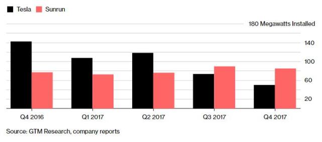 据研究公司GTM Research估计,特斯拉在去年第四季度共安装了87兆瓦的商用和住宅太阳能,其中住宅太阳能为50兆瓦。而据周二的一份声明显示,竞争对手Sunrun公司在同期安装了85兆瓦的住宅太阳能系统。在去年第三季度,特斯拉的住宅太阳能安装量也不及Sunrun。