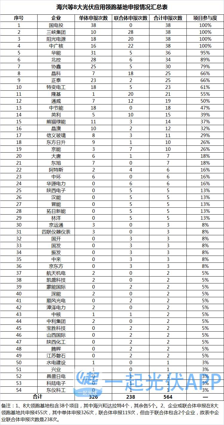 小跟班通过整理申报数据获知,包括国电投、阳光电源在内的54家电站投资或光伏制造企业以单体或联合体形式参与了8个基地38个项目的申报,总申报次数达到了445次,其中单体申报326次,联合体申报119次。