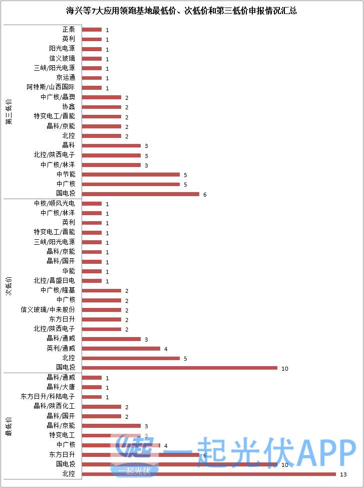 综合来看,本次8大光伏应用领跑基地共有54家企业以单体或联合体的形式参与竞争,且多以光伏制造或电站投资企业为主,其中国电投、北控、晶科等少部分企业的参与度较高,并且报出低价的次数也较多,中标概率将会更大一些,而报出低价次数最多的国电投、北控或将成为本次领跑基地的最大赢家。