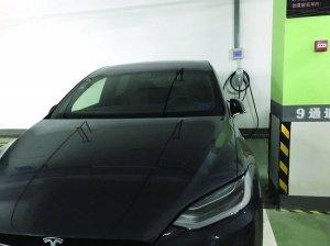 3 月 21 日 , 在南京河西的仁恒江湾城小区停车场 , 记者看到 , 墙壁上安了两个小巧的壁挂式充电桩 , 一辆特斯拉正在充电。