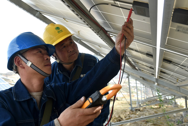 3月28日,电力工人在将军岭村光伏发电项目内检测发电设备。