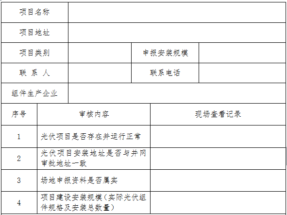 2、各组织单位负责对辖区内申报项目进行实地核查。核查内容包括:项目是否存在并正常运行、实际安装地址是否与电网审批地址一致、场地申报资料是否属实。核查结果须填写《农村地区分布式光伏发电项目现场核查记录单》。