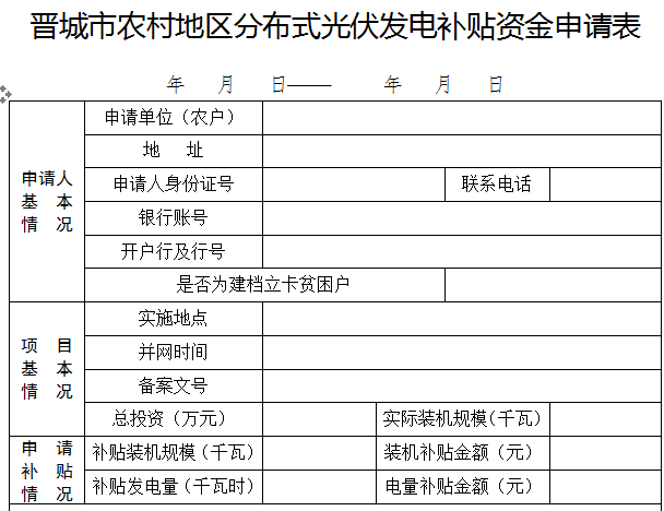 1、《晋城市农村地区分布式光伏发电补贴资金申请表》;
