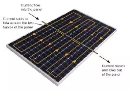 (1)电池片一分为二,主栅电流减半,整个组件的电流损失减小到原来的1/4,输出功率比同版型整片电池组件高约5-10W;