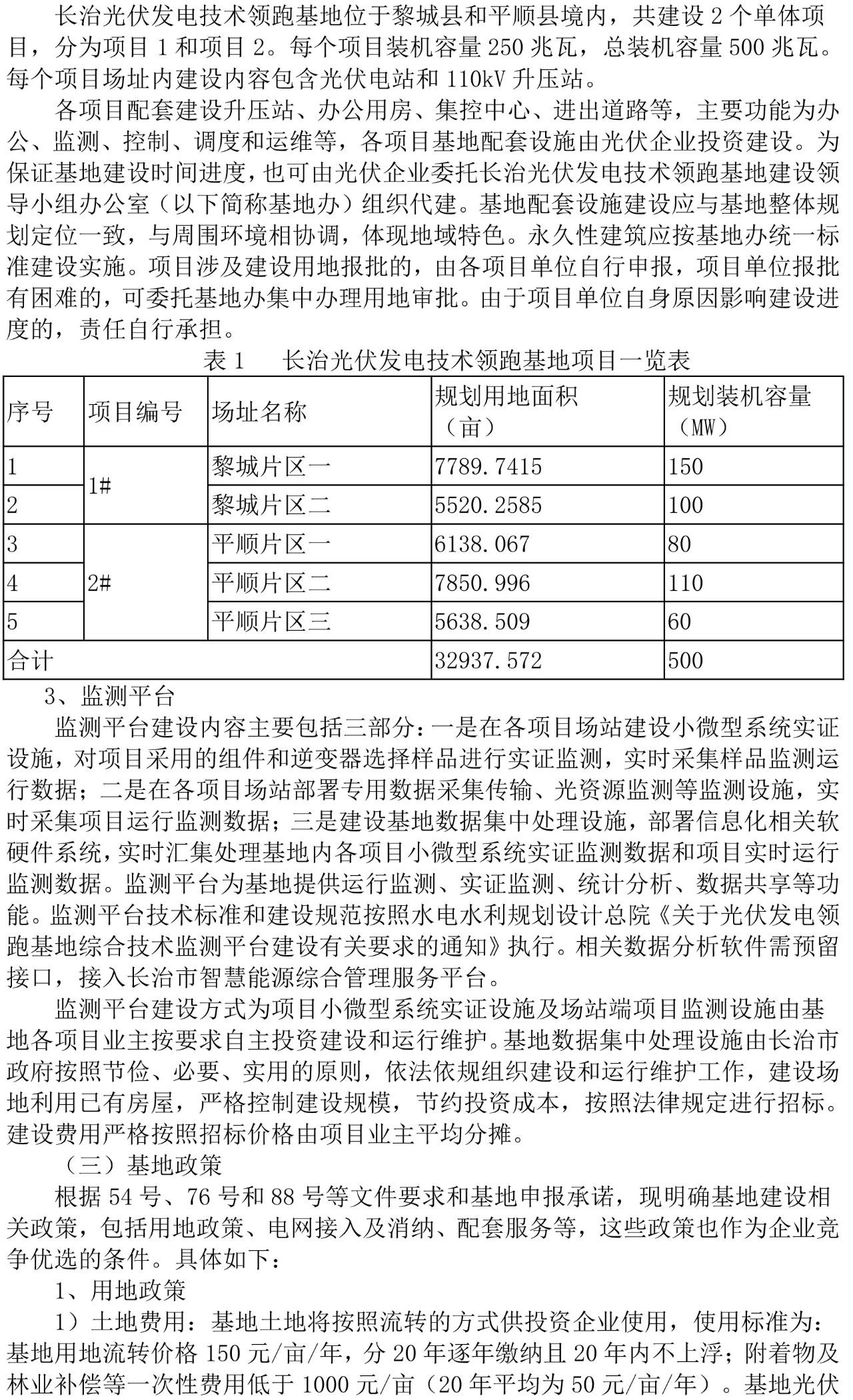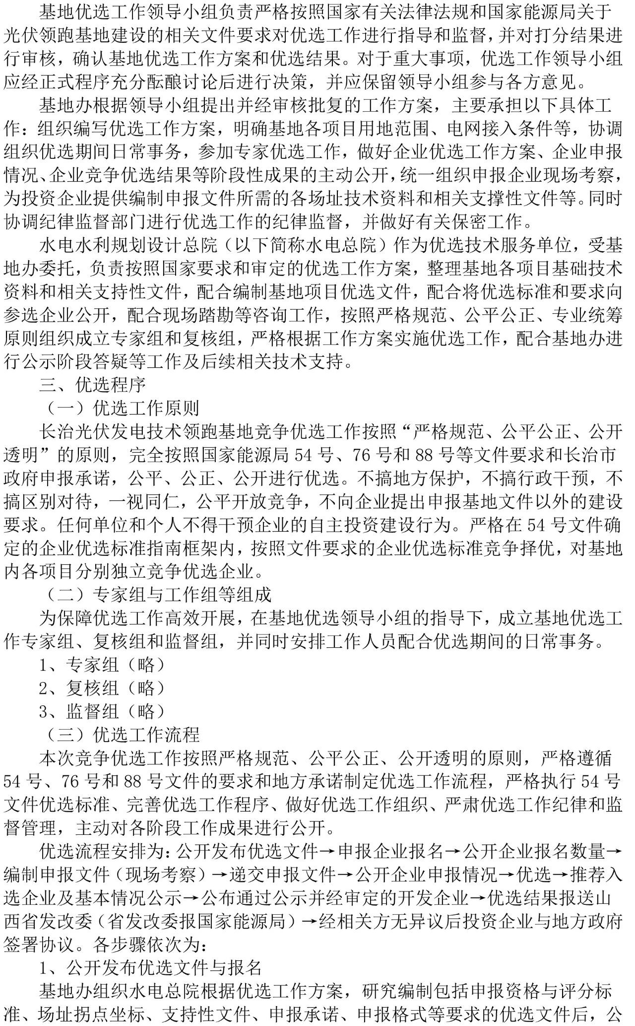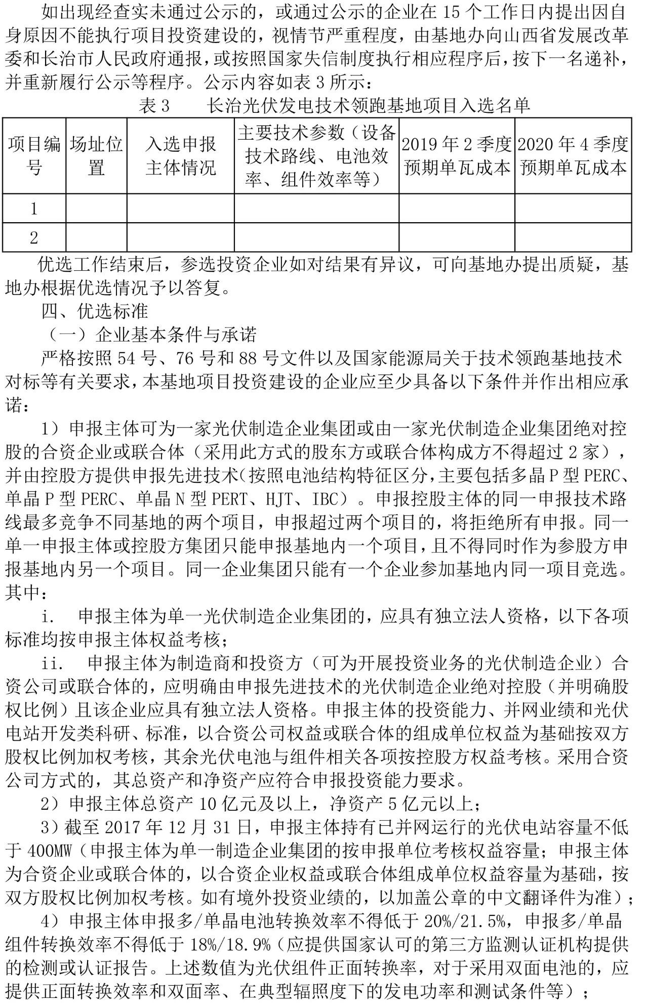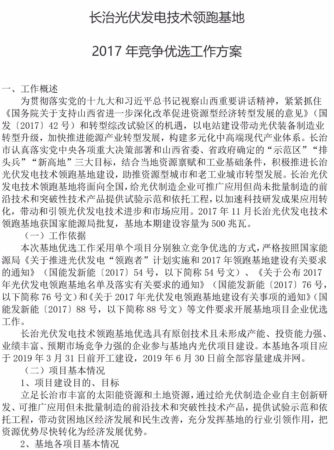 2018年4月14日上午,山西长治市政府公布《长治光伏发电技术领跑基地2017年竞争优选工作方案》,至此,三个技术领跑者基地优选活动都已正式开始。