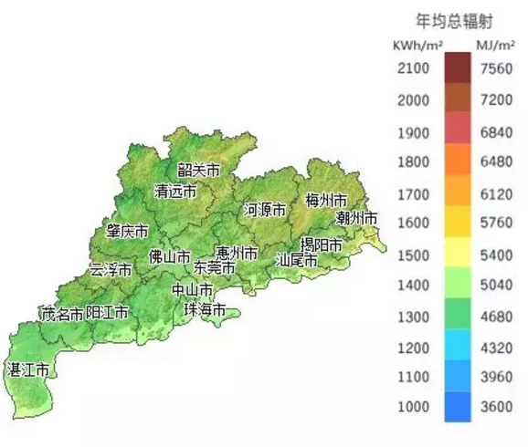 广东省除粤北山区外,大部分地区为南亚热带和热带季风气候类型,属于我国太阳能资源三类地区,全年日照时数为2200~3000小时,辐射量在502~586x104kJ/cm2˙a,相当于170~200kg标准煤燃烧所发出的热量。广东日照时间长、辐射总量大,每年阴雨天时间仅60~80d。全省各地太阳总辐射年变化趋势有单峰型和双峰型两种,单峰型太阳总辐射以7月份最大,2月份最小,全省除雷州半岛的徐闻和雷州以外,全省其他地区都表现为这种类型。粤西沿海地区,一年经历多次12级以上台风,对光伏产品的抗风压提出了挑战。