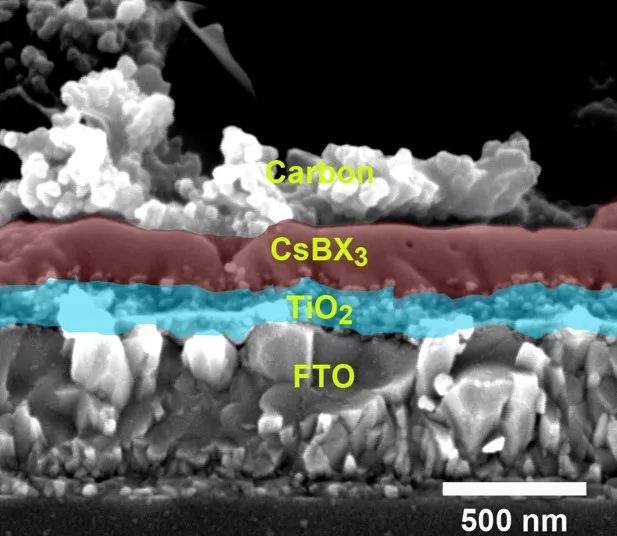 这种材料具有几种关键特征。首先,它是完全无机的(一个重要的变化),因为有机成分通常不耐热,性能会在高温条件下退化。因为太阳能电池会在太阳光照射下变得过热,所以热稳定性显得非常关键。通过无机材料取代有机成分,钙钛矿太阳能电池会变得更加稳定。