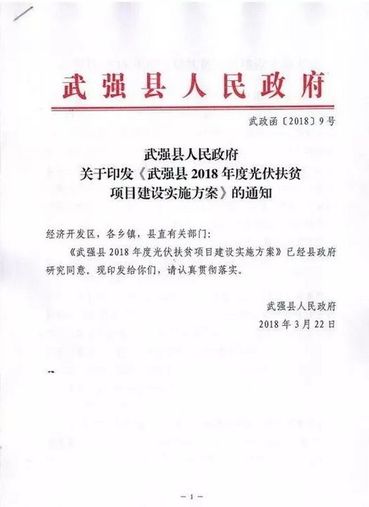 为深入贯彻落实省委省政府《关于坚决打赢脱贫攻坚战的决定》和省扶贫开发领导小组2017年第一次全体会议精神,确保武强县2018年整体脱贫出列,按照省发展和改革委员会、省扶贫开发办公室等部门《关于推动村级光伏扶贫电站(含户用)建设的指导意见》(冀发改能源〔2016〕1201号)》、《关于下达2017年第一批村级光伏扶贫项目通知》(冀发改能源〔2018〕16号)、省发改委、扶贫办、税务局《关于光伏扶贫收益分配指导意见》(冀扶办联〔2017〕17号)等文件要求,扎实推进我县村级光伏扶贫电站、分布式光伏电站项目建设,对接精准扶贫、精准脱贫工作,帮助贫困户持续、稳定的增收,特制定本方案。