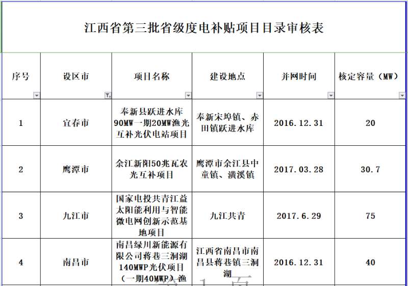 根据《江西省光伏发电项目省级度电补贴资金管理及发放暂行办法》,我局会同省财政厅、省电力公司及相关专家对第三批拟申请省级度电补贴资金的光伏发电项目进行了审核,现将拟列入第三批省级光伏度电补贴目录的项目予以公示,公示期为7个工作日。公示期内,如对审核结果持有异议,任何单位和个人均可以书面或电话形式向省能源局提出意见。