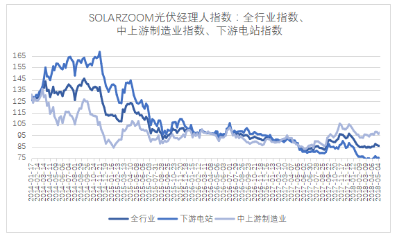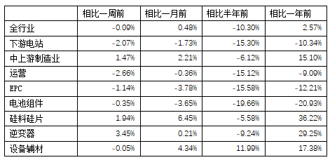 中上游制造业指数为电池组件指数、硅料硅片指数、逆变器指数、设备辅料指数的加权平均,反映了光伏中上游制造业企业的景气程度。下游电站指数为EPC指数和运营指数的加权平均,反映了电站EPC和运营行业整体的景气程度。而全行业指数由中上游制造业指数和下游电站指数加权平均得出,反映了市场对于光伏行业整体未来发展的预期,表明了光伏行业整体的景气程度。