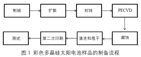 本文利用PECVD 一次性沉积彩色减反膜,并通过腐蚀降低印刷区域的减反膜厚度,经过印刷烧结后,制得彩色多晶硅太阳电池。