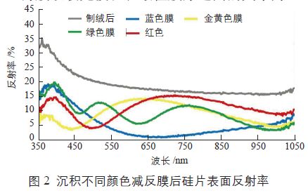 随着减反膜膜厚的增加,平均反射率也依次增高,金黄色、紫红色和绿色多晶硅太阳电池的反射光在可见光范围内出现波峰和波谷逐渐增多,这与文献[5] 的测试结果基本一致。