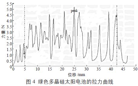 采用350 ℃的电烙铁对彩色多晶硅太阳电池的正面电极进行焊接,并测试焊接拉力。4 种颜色的多晶硅太阳电池的拉力测试结果如表4 所示,图4 为绿色多晶硅太阳电池的拉力曲线。