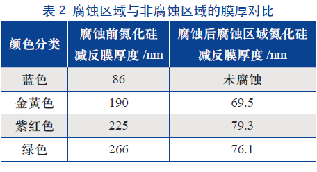 本文是采用印刷前一次性沉积彩色减反膜的方法,由于减反膜较厚,目前行业市场化的正面电极银浆无法穿透氮化硅减反膜而到达p-n 结,使正面银浆与硅基体不能形成良好的欧姆接触。因此,本文彩色多晶硅太阳电池在制备过程中最重要的工序是腐蚀,即在印刷前需对特定区域减反膜进行腐蚀处理。腐蚀后氮化硅减反膜的厚度也是至关重要的参数,表2 为氮化硅减反膜腐蚀前及腐蚀后腐蚀区域的膜厚对比。