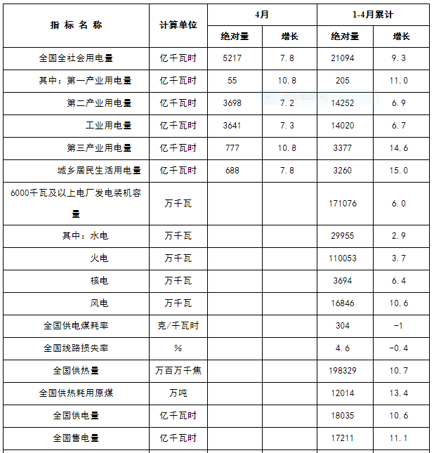 5月18日,国家能源局发布1-4月份全国电力工业统计数据。