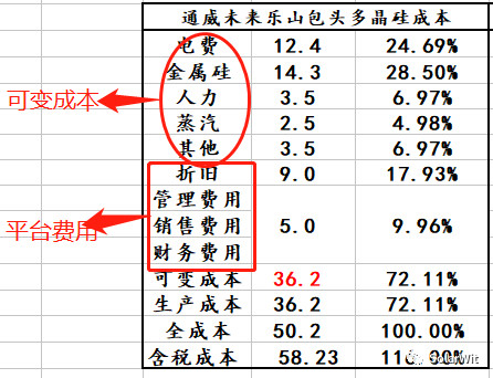 1、可变成本=电费+金属硅+人力+蒸汽+其他; 根据可变成本所包含的项目,我们很容易理解这它是随着产量的变化而变化的成本,是不开工就不发生的成本。以生产硅料所使用的重要原材料“金属硅”为例,大家每生产1kg多晶硅就需要约1.1kg金属硅,金属硅这一块的成本和产量的多少直接相关,而且是直接线性先关。电费也是同样道理,生产得越多,电费就越高,也是线性相关。这其中人力成本需要特别解释一下,我们并不能简单的把人力成本理解为支付给员工的工资,可变成本项目内的人力成本是指和生产活动直接相关的人力成本支出,如果工资是支付给车间主任、公司高管、售前售后等人员,他就不能记录到现金成本项目下,而是要记入到管理成本或销售成本项目下。总之现金成本就是指和生产活动直接相关,随产量多寡变化而变化的可变成本。(备注,我先前一直认为可变陈本=现金成本;而且很多产业内的朋友也习惯于这样用,出于写文章严谨的考虑,我请教了财务专家,专家说这样并不完全准确,为了准确起见我本篇文章统一称为可变成本,而我之前文章所提到的现金成本就是本篇文章的可变成本)