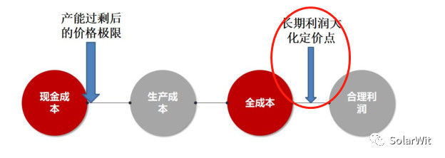 所以当资金沉淀在产能设备前,价格低于合理利润就可以阻止新产能进入;可是一旦当资本变为了产能,那么要想逼停产能,价格就必须跌破现金成本才行。所以短期高价的策略在没有进入壁垒的行业里,必然引发长期低价的结果。尤其在产能出清的阶段,势必会使得大家都很难受。真正长期利润最大化的定价点是比合理利润略低的定价(图中圈红圈的地方)