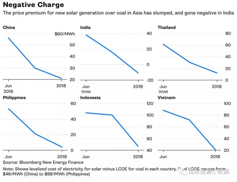 2016年6月份光伏比煤电贵10.4美分/千瓦时;2018年6月光伏比煤电贵4.7美分/千瓦时