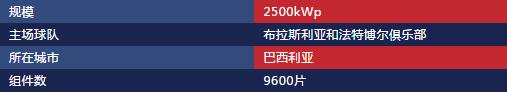 场馆简介:巴西国家体育馆前身是加林查体育场,兴建于1974年。为迎接2014年巴西世界杯而重建,2010年更名为巴西国家体育馆,现为巴西第二大体育场。巴西国家体育馆装有9600块光伏组件,装机总量达2.5兆瓦,年发电量达270多万度,为全球之最。