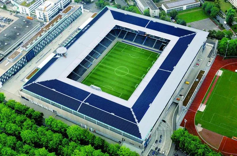 场馆简介:2006德国世界杯之际,凯泽斯劳滕球场球场进行了整体改造,场馆顶上装上了总装机容量1兆瓦的太阳能光伏发电系统,是当时世界上最大的足球场太阳能屋顶发电工程;年发电量达60多万度,据称项目竣工后连续四个月的发电量均超出设计发电量30%。