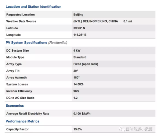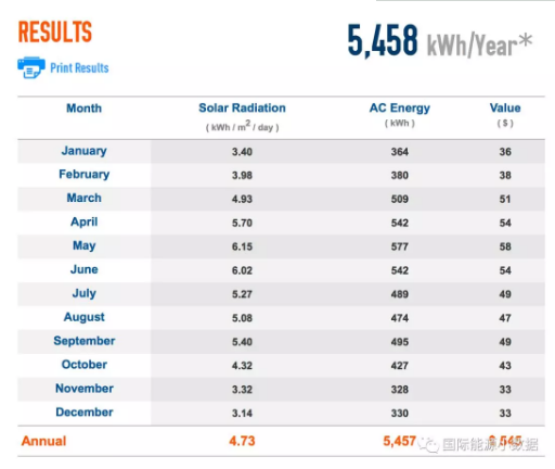 如果在计算器中输入“北京”,系统会显示出北京的经纬度和光照强度,在系统装机4KW、电费为10美分/千瓦时(人民币0.65元/千瓦时)情况下,那么一年收益为545美元(3540人民币)。