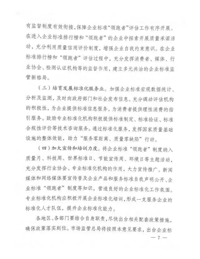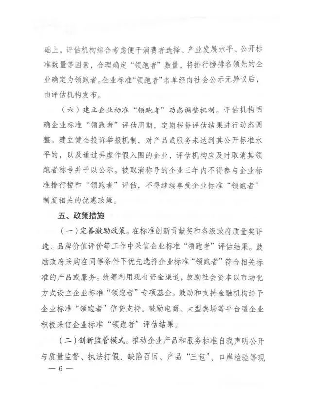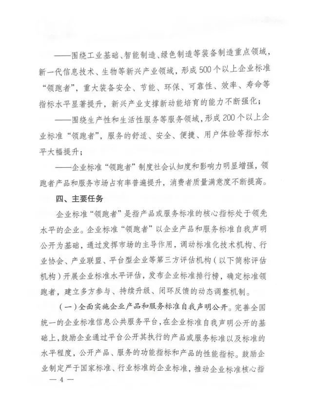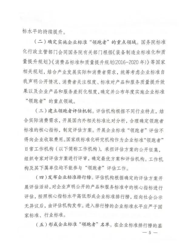 《意见》明确了实施企业标准“领跑者”制度的指导思想和基本原则,提出到2020年我国在主要消费品、装备制造、生产性和生活性服务以及新兴产业领域企业标准“领跑者”培育目标。《意见》根据企业标准“领跑者”制度工作流程,提出了全面实施企业产品和服务标准自我声明公开、确定实施企业标准“领跑者”的重点领域、建立领跑者评估机制、发布企业标准排行榜、形成企业标准“领跑者”名单、建立企业标准“领跑者”动态调整机制6项任务;提出了完善激励政策、创新监管模式、培育发展标准化服务业、加大宣传和培训力度4方面保障措施。企业标准“领跑者”制度的实施,对于培育一批具有创新能力的排头兵企业、助推供给侧结构性改革具有重要作用,有利于推动我国产业迈向全球价值链中高端,更好地满足人民日益增长的美好生活需要。
