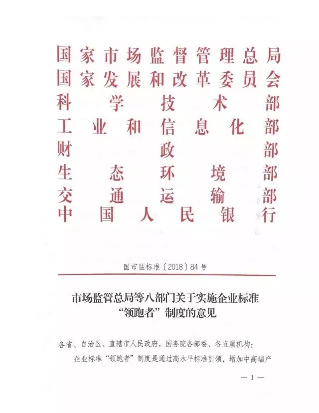 近日,经国务院同意,市场监管总局、发展改革委、科技部、工业和信息化部、财政部、生态环境部、交通运输部、人民银行等八部门联合印发《关于实施企业标准“领跑者”制度的意见》(国市监标准〔2018〕84号)(以下简称《意见》)。