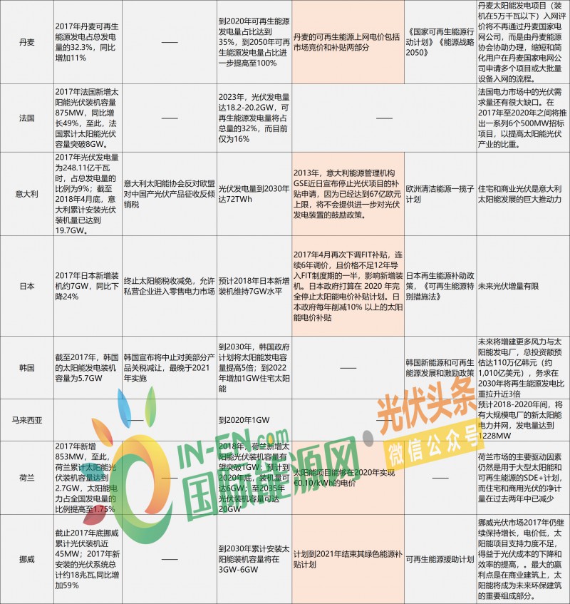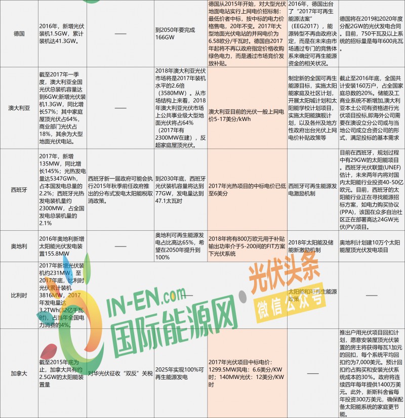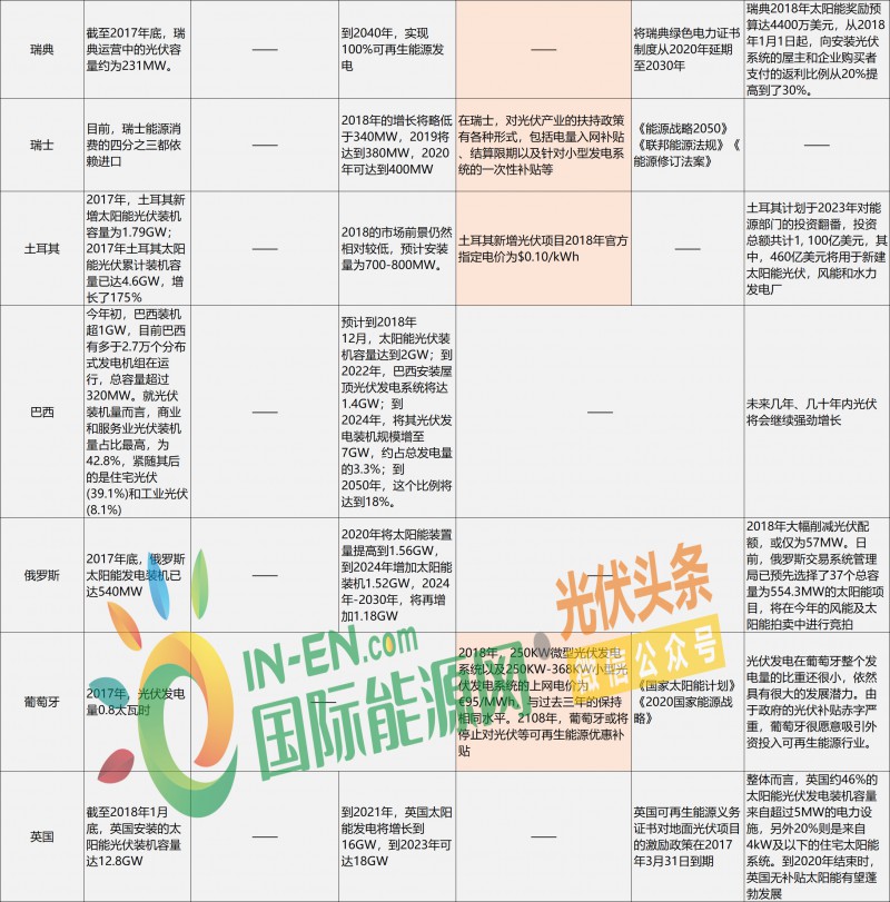 8)对光伏激励措施呈多样化。加拿大推出户用光伏项目回扣计划,愿意安装屋顶光伏装置的房主将获得每瓦1加元的回扣,每个系统平均回扣约为7,000美元。丹麦太阳能发电项目(装机在5万千瓦以下)入网评价将不再通过丹麦国家电网公司,而是由丹麦能源协会协助办理,缩短和简化用户在丹麦国家电网公司申请多个项目或大批量设备入网的流程。瑞典2018年太阳能奖励预算达4400万美元,从2018年1月1日起,向安装光伏系统的屋主和企业购买者支付的返利比例从20%提高到了30%。秘鲁正在准备对其能源政策进行改革,以支持更多的可再生能源的普及。