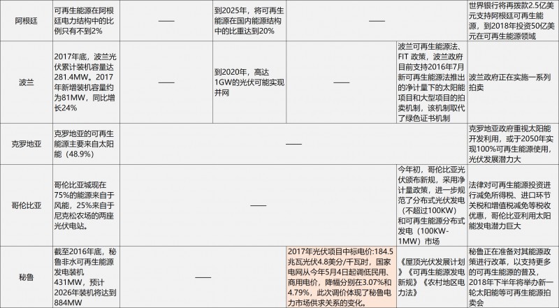 秘鲁是拉美地区率先大规模推广风电和太阳能发电项目的国家之一,但是秘鲁尚未建立行之有效的政策与完善的法律法规体系,且城市可再生能源发展空间较少,阻碍了秘鲁可再生能源的快速增长。整体来看,秘鲁政府未来以发展农村小型光伏项目为主,大型集中式光伏与风力发电项目发展空间较小。