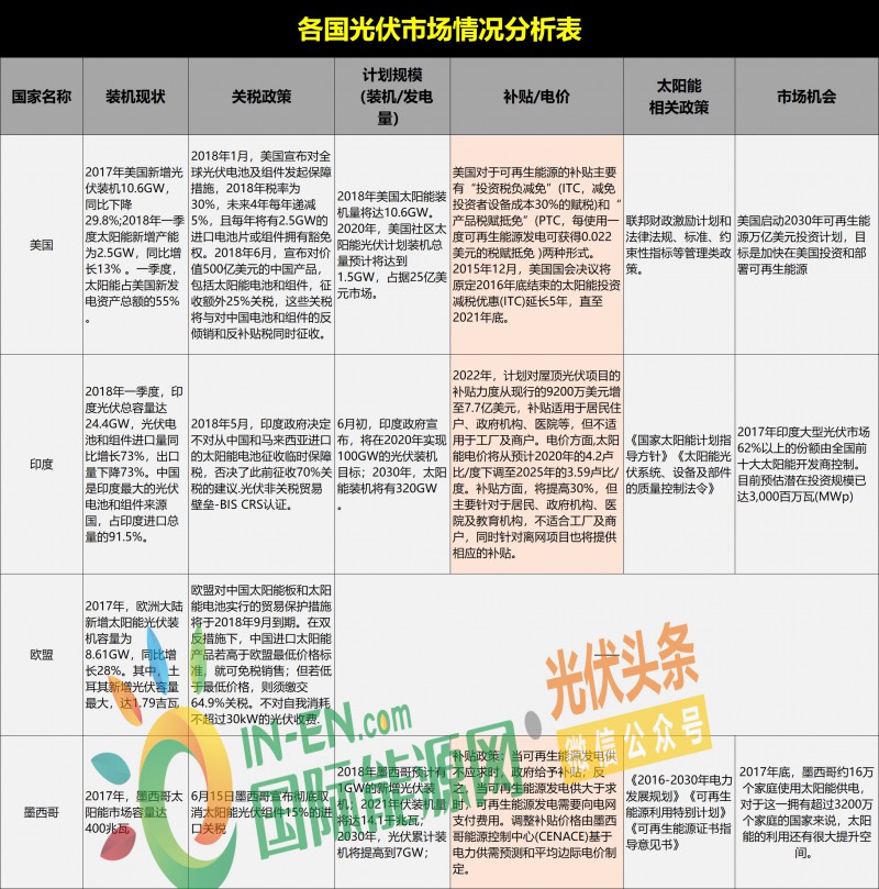 4)此前,虽然我国光伏产品在出口海外的过程中遇到了英、美、印度等国家的反倾销政策,抑制中国高质量低价格光伏产品在其国内的出口额。但近期,欧盟、印度、墨西哥、西班牙、意大利等国均在光伏产品关税上面松口并表达取消或者抵制关税意向。如,欧盟对中国太阳能板和太阳能电池实行的贸易保护措施将于2018年9月到期、印度政府决定不对从中国的太阳能电池征收临时保障税并否决了此前征收70%关税的建议、墨西哥宣布彻底取消太阳能光伏组件15%的进口关税、西班牙可能会执行分布式发电太阳能税取消政策、意大利太阳能协会反对欧盟对中国产光伏产品征收反倾销税。