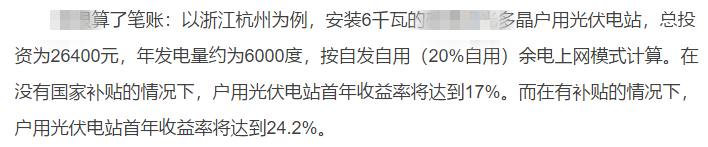 必须指出,“首年收益率”是一个耍流氓的概念。很多城市有地方性光伏补贴,以上面提到的杭州为例,根据《杭州市人民政府关于进一步加快太阳能光伏推广应用促进光伏产业创新发展的实施意见》(杭政函〔2016〕79号),对2018年12月31日前并网的分布式光伏发电项目,给予0.1元/kWh度电补贴,连补60个月。加上浙江0.1元/kWh的省补,首年收益率能达到14.54%;如果项目刚好位于富阳区或萧山区,还能拿到区级补贴,达到17%并非虚言。