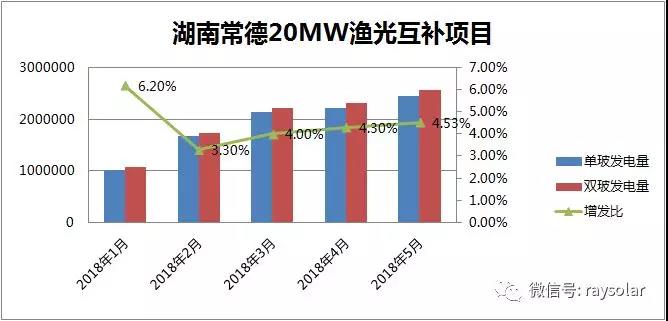 行走的双玻第四站湖南常德40MW渔光互补项目并网半年啦!我们将20MW的双玻发电数据做了追踪分析,发现双玻电站月均发电量竟然比单玻发电量高出4.5%!双玻组件在渔光互补电站的表现赢得客户极大认可。