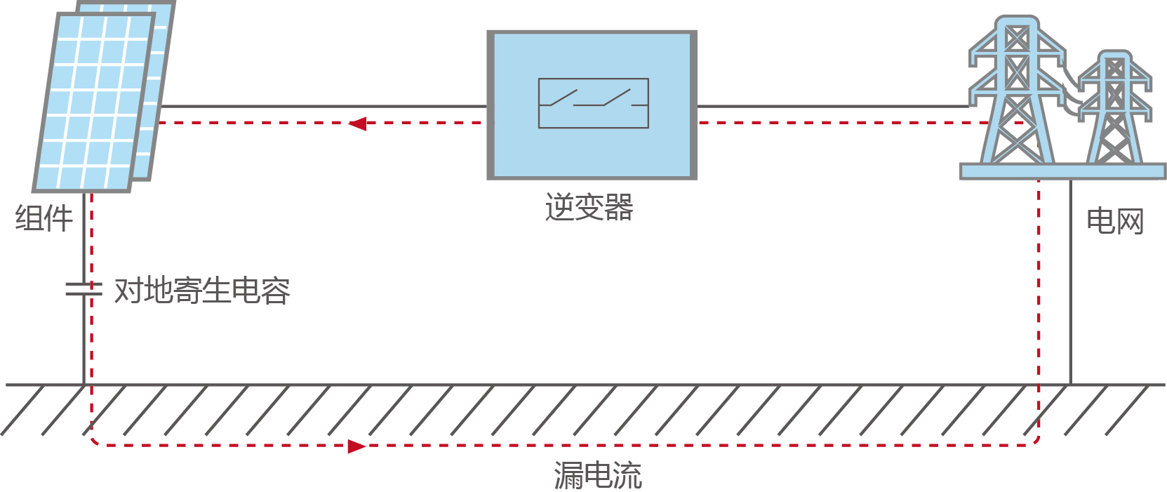 光伏发电系统中,电网、逆变器、组件及其对地寄生电容之间会形成回路,回路中光伏直流侧对地电压变化会引起漏电流问题(图1)。一般来说, 受雨天等潮湿环境、组件或电缆绝缘损伤等因素影响,漏电流会升高甚至发生异常。
