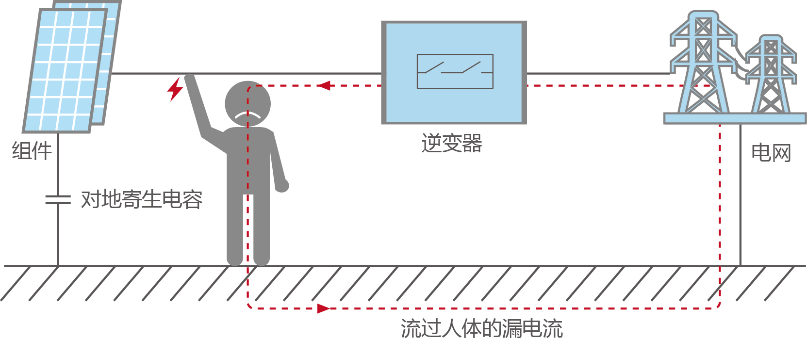 正常情况下,如果人体触碰光伏组件或支架,因为人体阻抗大于接地阻抗,流过人体的电流就很小,绝大部分电流从接地体流过(分流作用),从而可以避免人体受到伤害。但是,倘若人体有意或无意触碰到绝缘不良的带电体,并且保护措施不到位,导致漏电流经过人体流向大地形成回路(图2)。只要通过人体的漏电流超过限值和时间,人体无法及时跳脱带电体,就有可能引起安全事故。