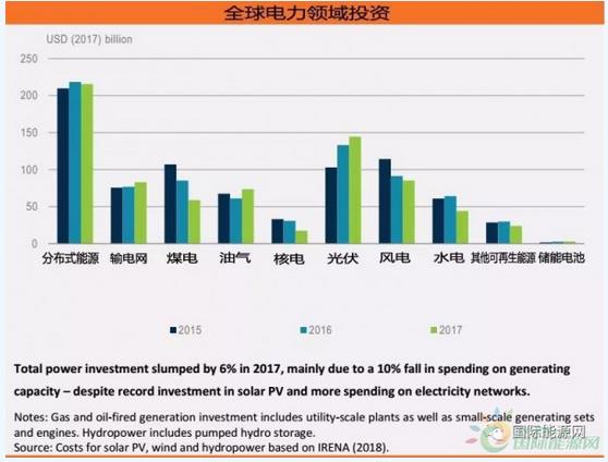 2017年全球电力投资额达7500亿美元,同比下降6%。过去的十年,由于可再生能源项目开发补贴政策的出台,以及升级、扩大电网等措施,全球电力行业成为资本需求高的行业。资本需求不高的热发电投资所占份额继续下降。