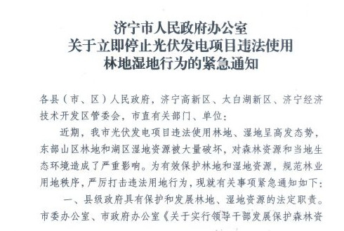 2015年6月19日,济宁市林业局《济宁市关于立即停止光伏发电项目违法使用林地湿地行为的紧急通知》