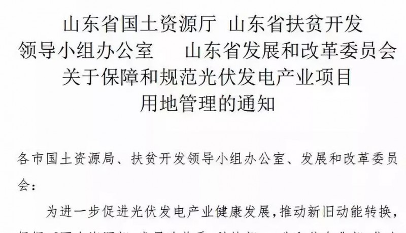 2018年6月21日,山东国土资源厅、山东扶贫办、山东发改委《关于保障和规范光伏发电产业项目用地管理的通知》