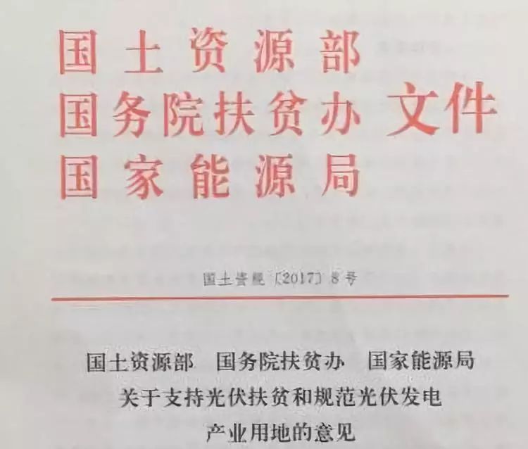 2017年9月,国土资源部、国务院扶贫办、国家能源局联合印发《关于支持光伏扶贫和规范光伏发电产业用地的意见》