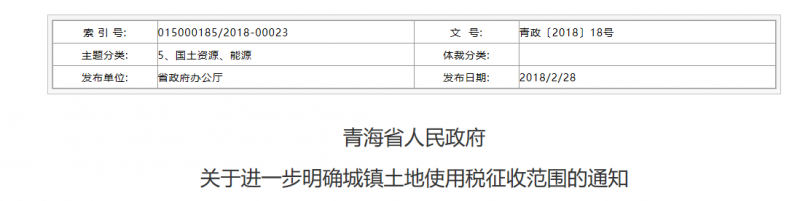 2018年2月,青海人民政府《关于进一步明确城镇土地使用税征收范围的通知》。