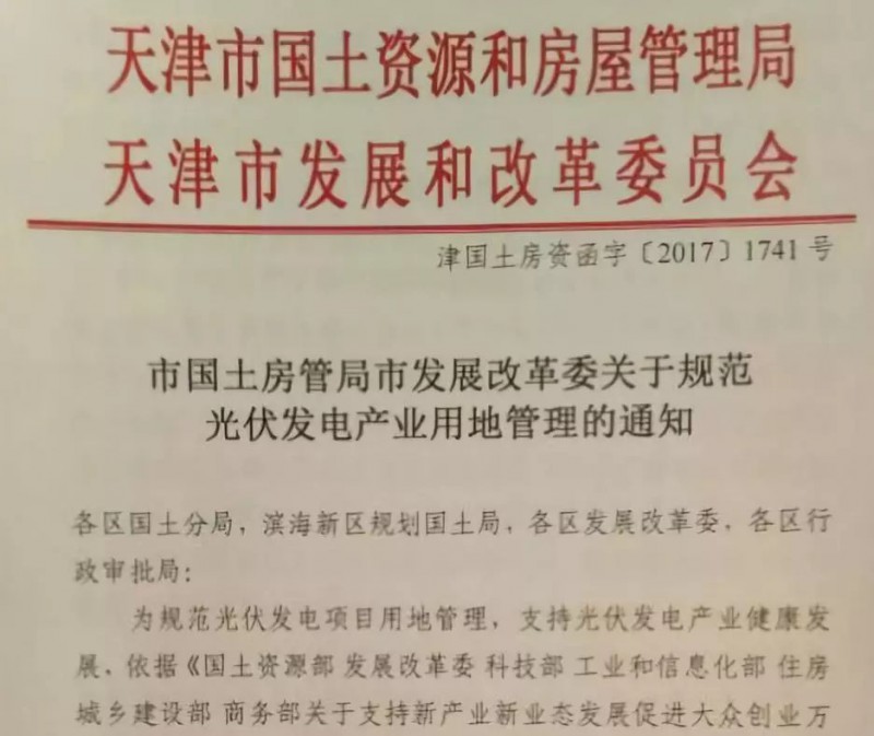 2017年12月11日,天津市国土局、发改委联合发布《关于规范光伏发电产业用地管理的通知》