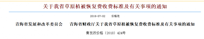 2018年7月,青海省发改委、财政厅《关于我省草原植被恢复费收费标准及有关事项的通知》