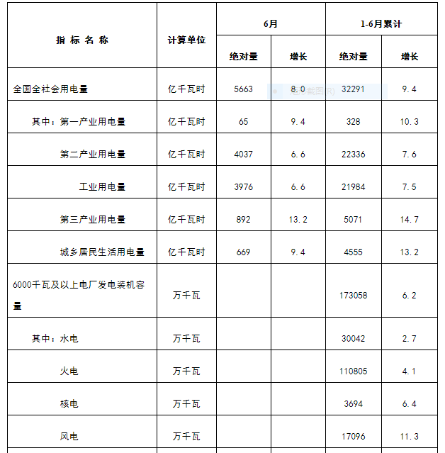 7月23日,国家能源局发布1-6月份全国电力工业统计数据。